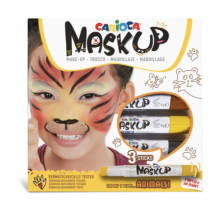 Karton kutu içinde 3 yüz boyası ve tema ile ilgili görselli 2 örnek boyama örneği